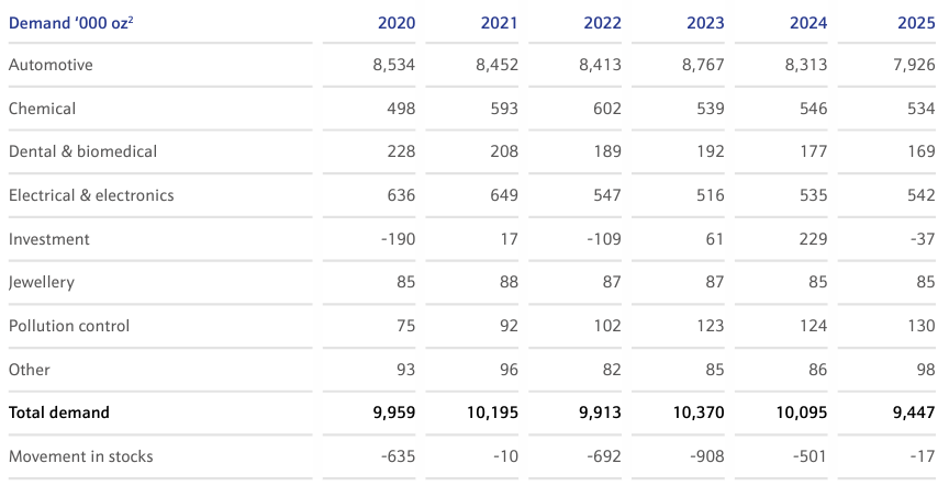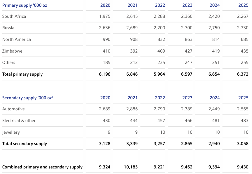 Palladium recorded a 17,000 troy ounce deficit in 2025, with demand exceeding supply in every year between 2020 and 2025.
