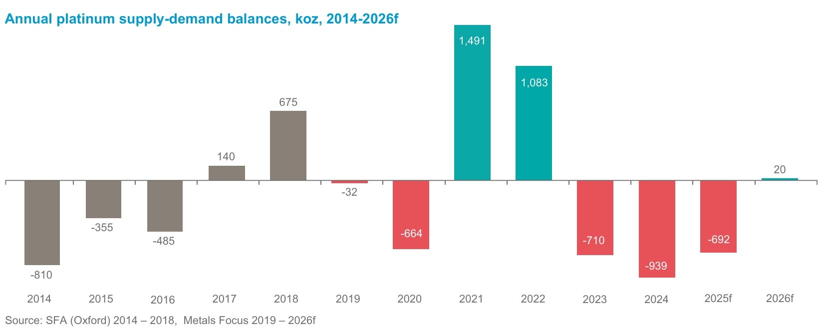 Platinum is projected to move into a modest 20,000 troy ounce surplus in 2026. While technically a surplus, this follows significant deficits between 2023 and 2025.