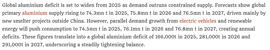 Aluminium is increasingly constrained by energy intensity, production caps, and limited capacity growth outside China.