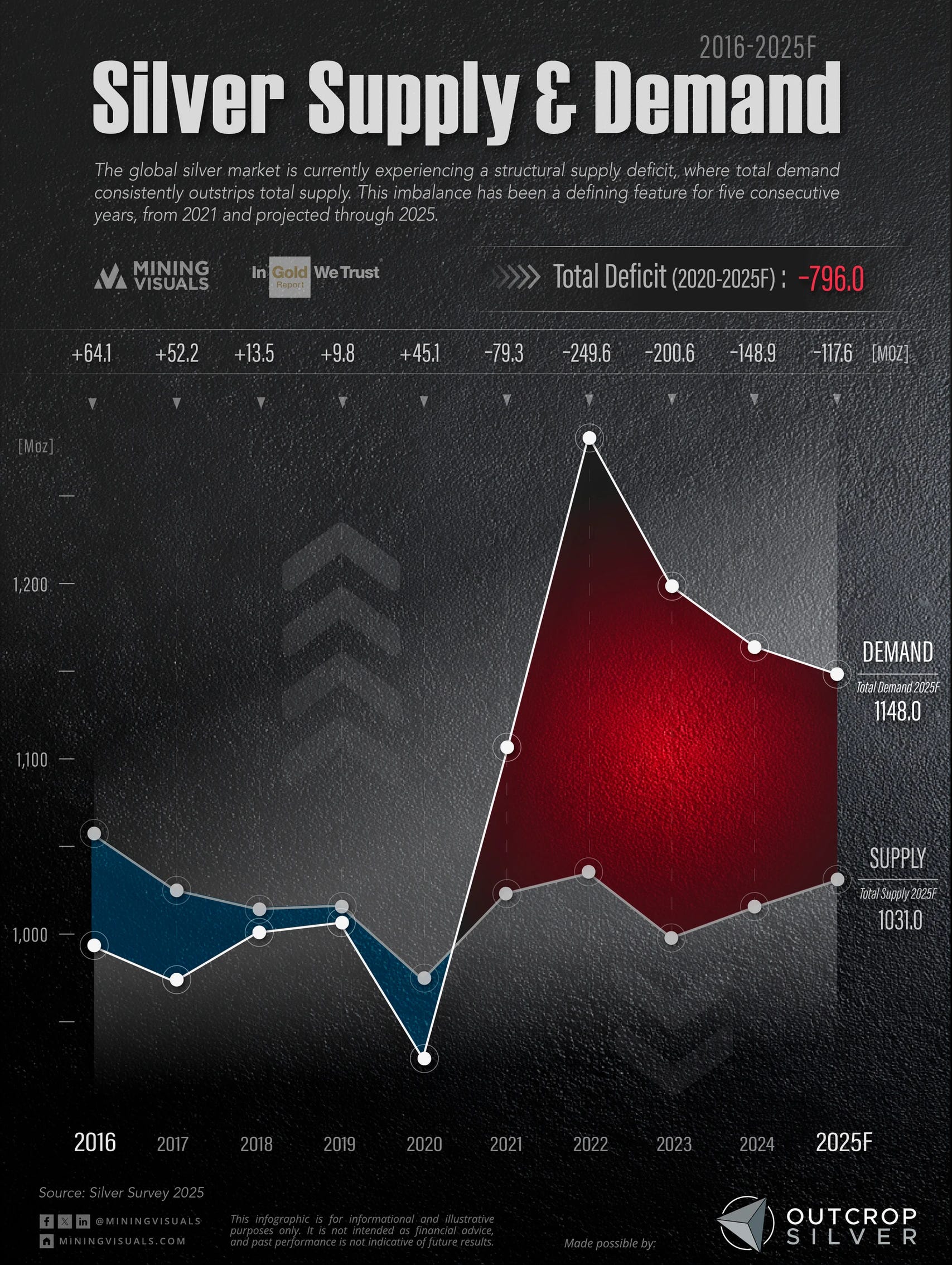 MiningVisuals’ Outcrop Silver-sponsored chart of silver supply and demand from 2016–2025 illustrates this shift clearly, showing a persistent deficit emerging after years of relative balance.